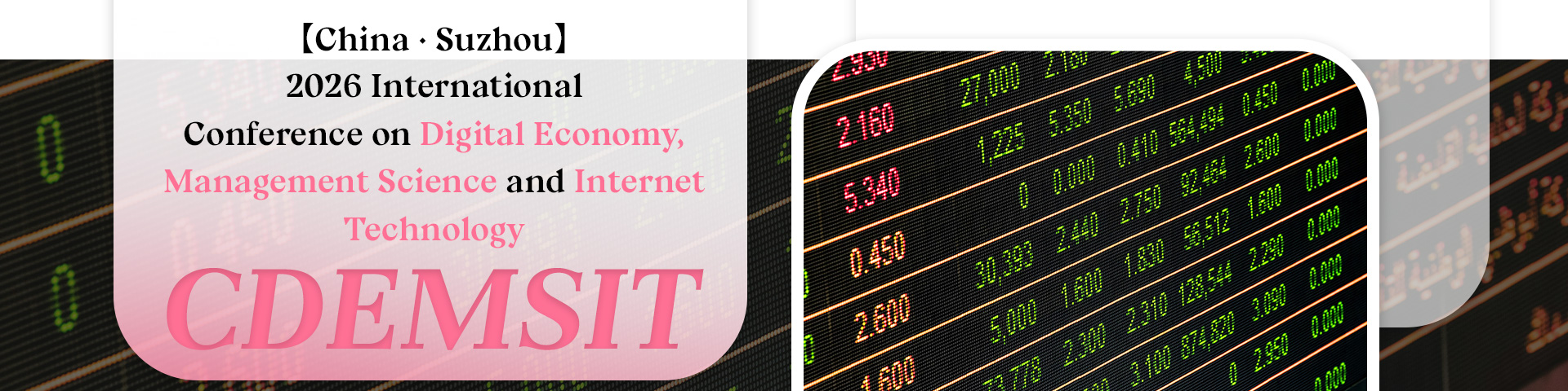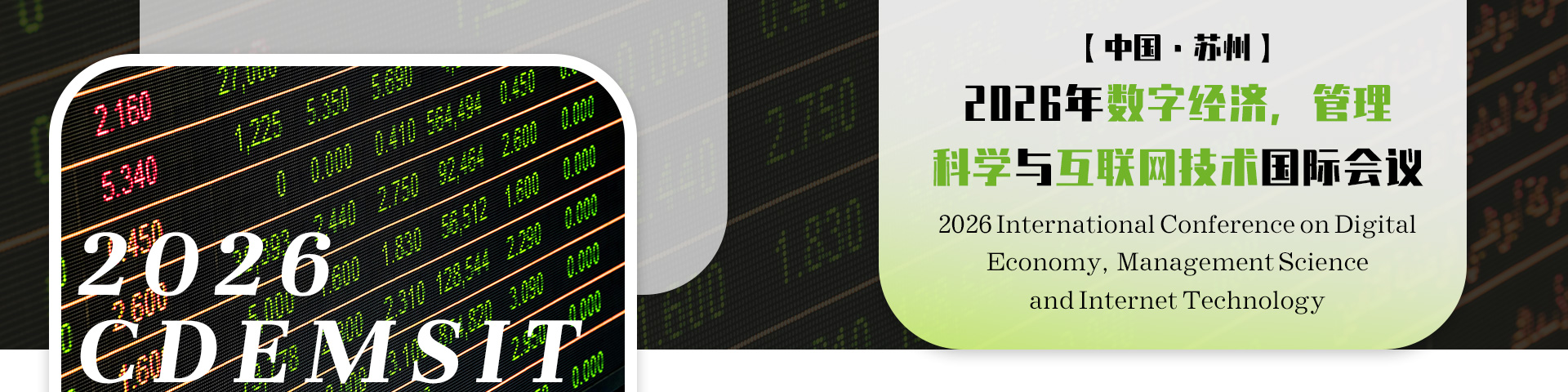 The 2026 International Conference on Digital Economy, Management Science, and Internet Technology (CDEMSIT 2026) will be grandly held in Suzhou, China. This international conference aims to provide a high-level and open academic exchange platform for experts, scholars, researchers, engineering technicians, enterprise managers, and policymakers from around the world who are engaged in research in the fields of digital economy, management science, internet technology, and related interdisciplinary areas. The conference will conduct in-depth discussions on hot topics such as digital economy model innovation, management science theories and methods, and the application and integrated development of internet technology. It aims to promote the deep integration of digital technology and economic management, and facilitate the digital transformation of enterprises and the implementation of national digital economy development strategies. CDEMSIT 2026 will bring together academic elites and industry experts from around the world to jointly explore management innovation and technological transformation in the era of digital economy, and promote international scientific research cooperation and collaborative industrial development. Conference Highlights Sharing cutting-edge research The conference will focus on showcasing the latest research achievements in the fields of digital economy, management science, and internet technology, covering hot topics such as digital finance and blockchain applications, big data-driven management decision-making, artificial intelligence and business intelligence, e-commerce and platform economy, network and information security, and smart supply chain management. Combination of theory and practice Through various forms such as keynote speeches, paper exchanges, case discussions, and technology demonstrations, we aim to promote the deep integration of academic research and practical application, and facilitate innovative practices of Internet technology in areas such as enterprise management, market operation, and public services. Interdisciplinary integration platform CDEMSIT 2026 is committed to building a multidisciplinary and integrated exchange platform, attracting experts and scholars from various fields such as economics, management, computer science, information engineering, data science, and sociology, to jointly explore new management theories and technology application paths in the era of digital economy. Dialogue on Policies and Industry Trends The conference will invite leaders from relevant internet enterprises, financial institutions, and management consulting firms to participate in in-depth exchanges and dialogues on hot topics such as digital economy development policies, management innovation trends, and internet governance. CDEMSIT 2026 will be a high-level and high-impact international event in the field of the integration of digital economy, management science, and internet technology, bringing together global wisdom to jointly explore the path of management innovation and technological transformation in the digital era. We sincerely welcome experts, scholars, researchers, and industry professionals from all over the world to actively participate in this event and join hands in promoting high-quality development in the digital economy and internet era in the beautiful city of Chongqing, China!